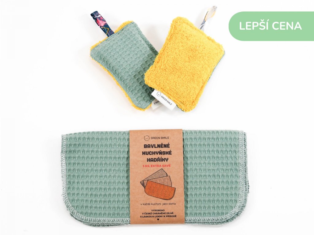 Osvěžte vzhled své kuchyně nadčasovými eko pomocníky. K těmto hadříkům na nádobí v zeleném provedení jsme ušili i houbičku na nádobí. Set je v lepší ceně v kategorii sety do kuchyně. Naleznete ZDE.