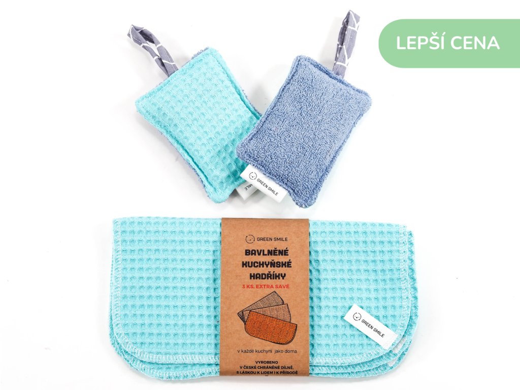 Osvěžte vzhled své kuchyně nadčasovými eko pomocníky. K těmto hadříkům na nádobí v modrém provedení jsme ušili i houbičku na nádobí. Set je v lepší ceně v kategorii sety do kuchyně. Naleznete ZDE.
