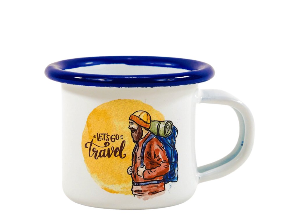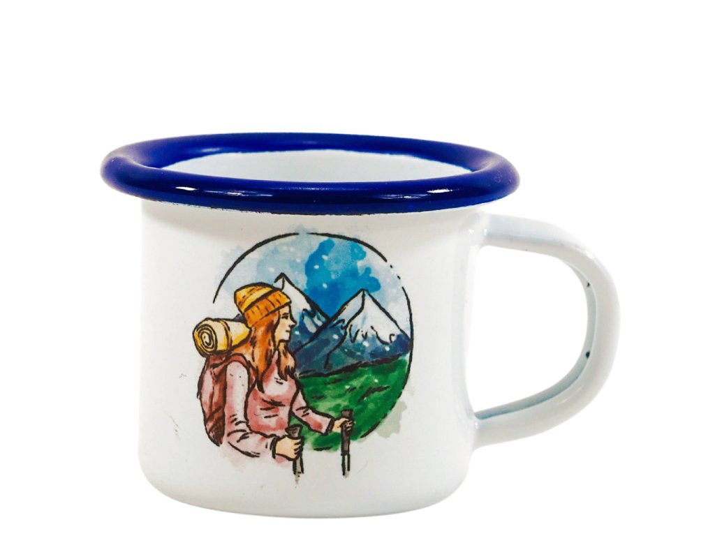 Mini plechové hrníčky s potiskem turistů.