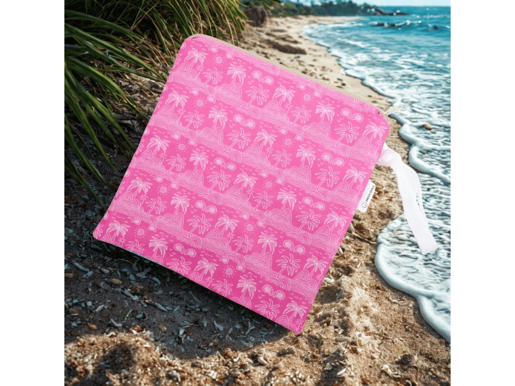 Obal na mokré plavky s motivem růžových palem oceníte na dovolené, u bazénu i během letních výletů. Voděodolné provedení zabraňuje pronikání vlhkosti, takže můžete bez obav uložit mokré plavky do tašky, batohu nebo cestovního kufru.
