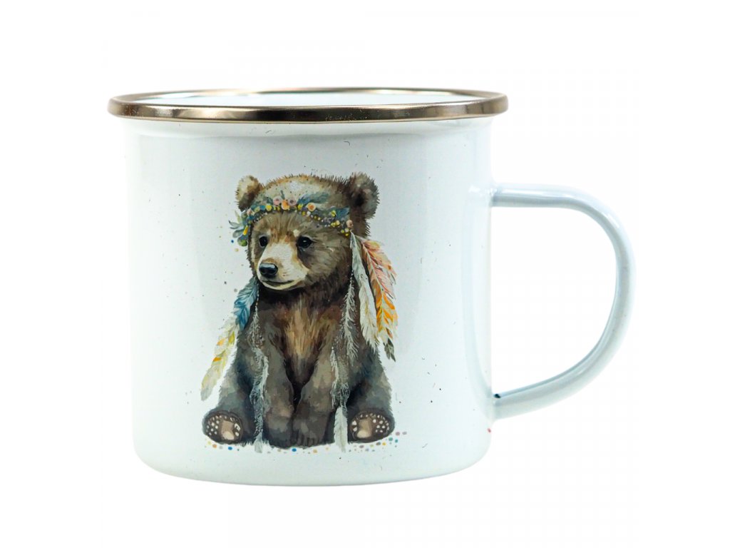 Smaltovaný hrnek s dětským motivem.
