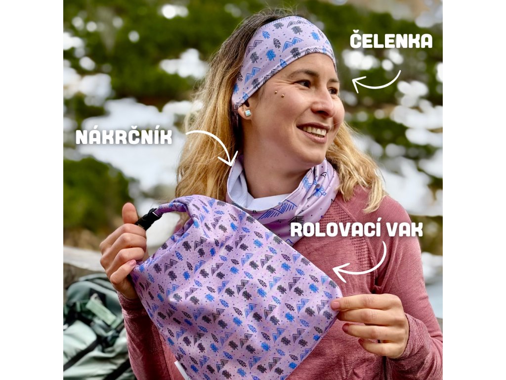 Pokud si chcete sladit svou zero waste svačinovou výbavu, ve stejném designu s fialovými stromečky nabízíme také čelenku a nákrčník. Celou sadu si můžete pořídit v tomto odkazu.
