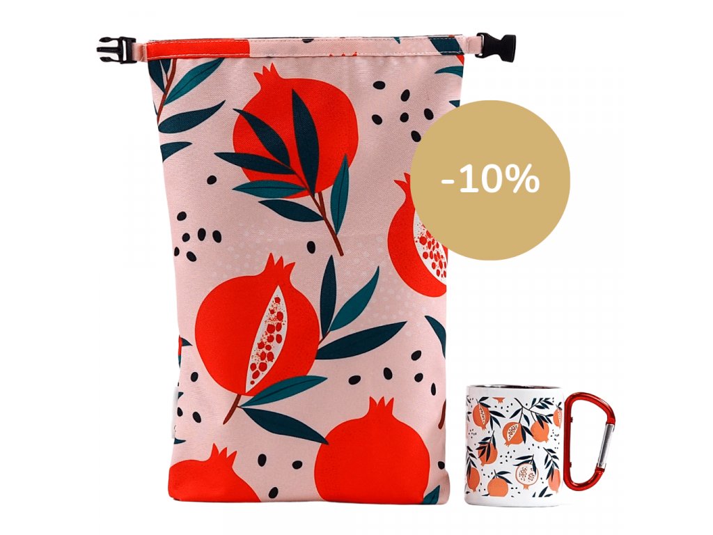 Svačinový set s potiskem granátových jablek si jednoduše zamilujete. Obsahuje velký rolovací vak na svačinu, který má atestace pro kontakt s potravinami. Kromě balení jídla jej můžete použít i jako praktický obal pro úschovu plavek, neboť se skládá ze dvou voděodolných materiálů. Je to praktický pomocník pro všechny cesty a výlety.