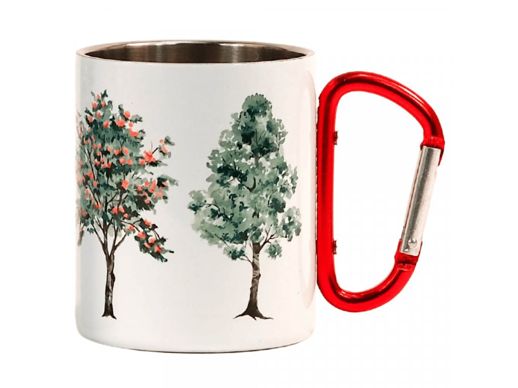 Dvouvrstvý nerezový hrnek s karabinou se stromy.