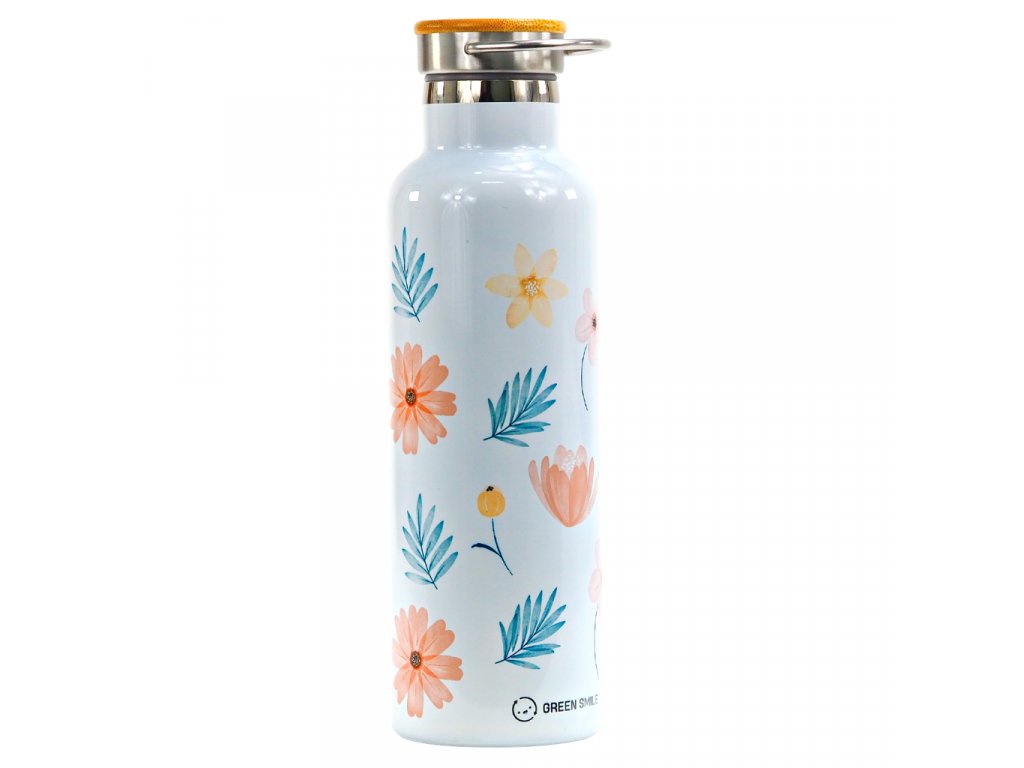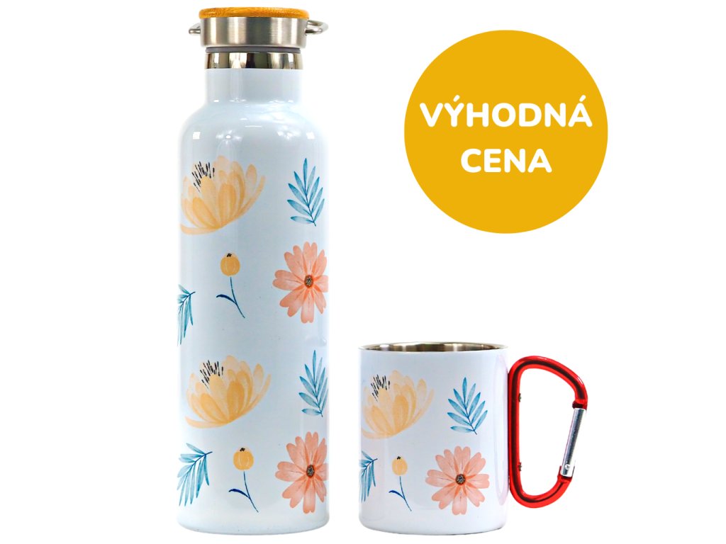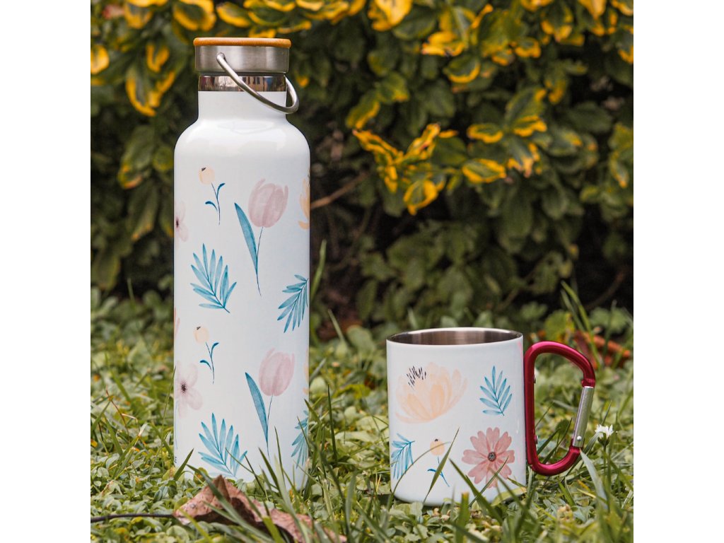 Termoláhev 750 ml s potiskem květin a termoplecháček s karabinou.