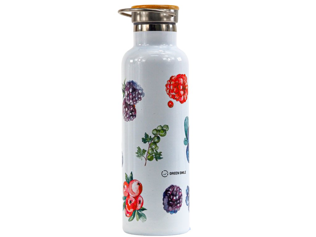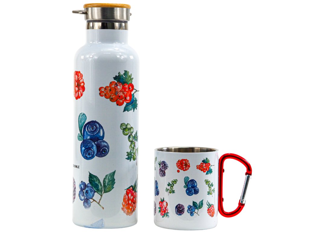 Termoláhev 750 ml s motivem lesního ovoce a termo plecháček s karabinou.
