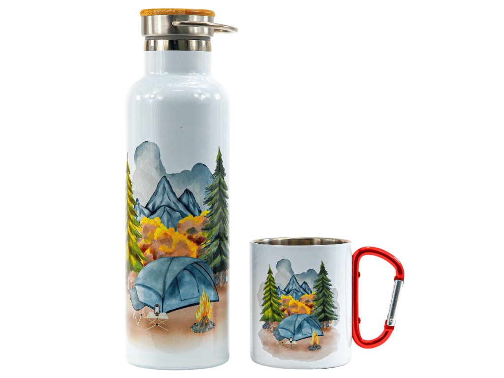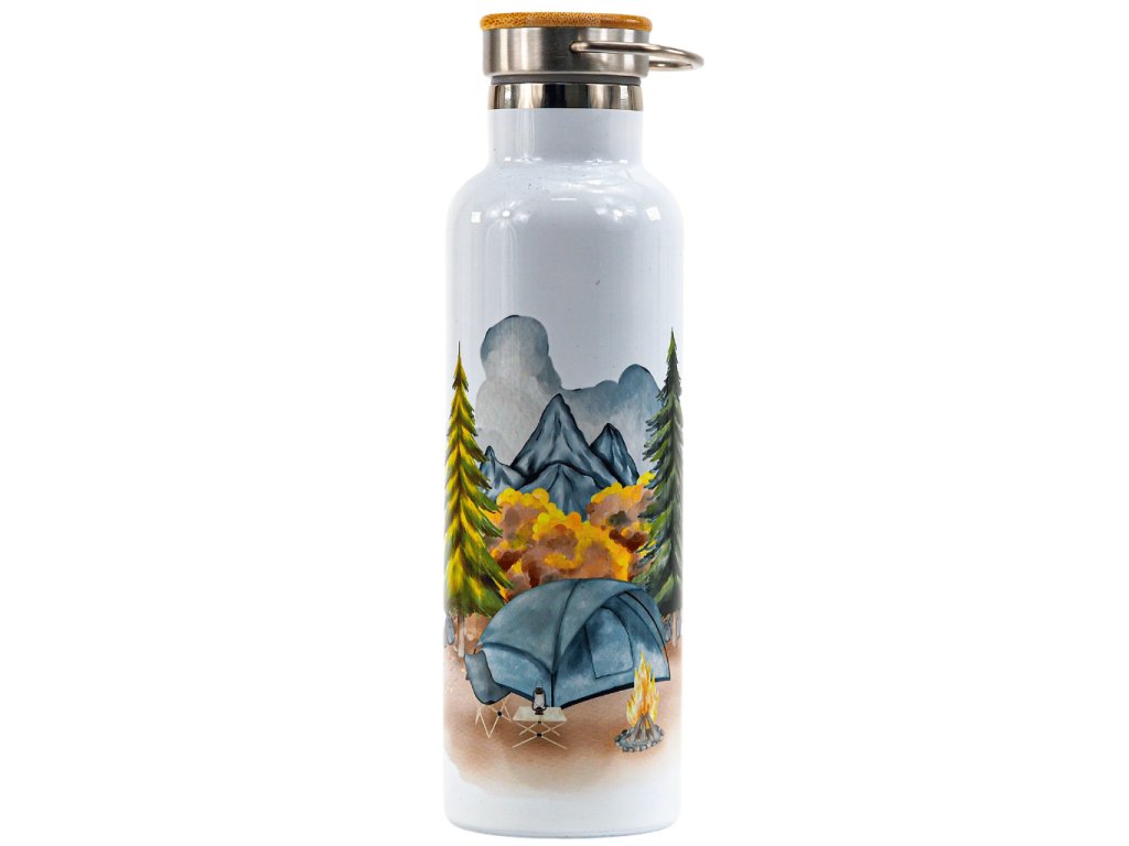 Designová termoska s bambusovým víčkem a potiskem kempování potěší každého milovníka přírody, který si svou kávu nebo čaj rád vychutnává na horách či loukách, ale také v pohodlí domova či práce. Spolu s termo plecháčkem tvoří dokonalý pár, který si zamiluje každý. Termohrnek má navíc praktickou karabinu, díky které se dá jednoduše zavěsit například na batoh nebo kabelku.