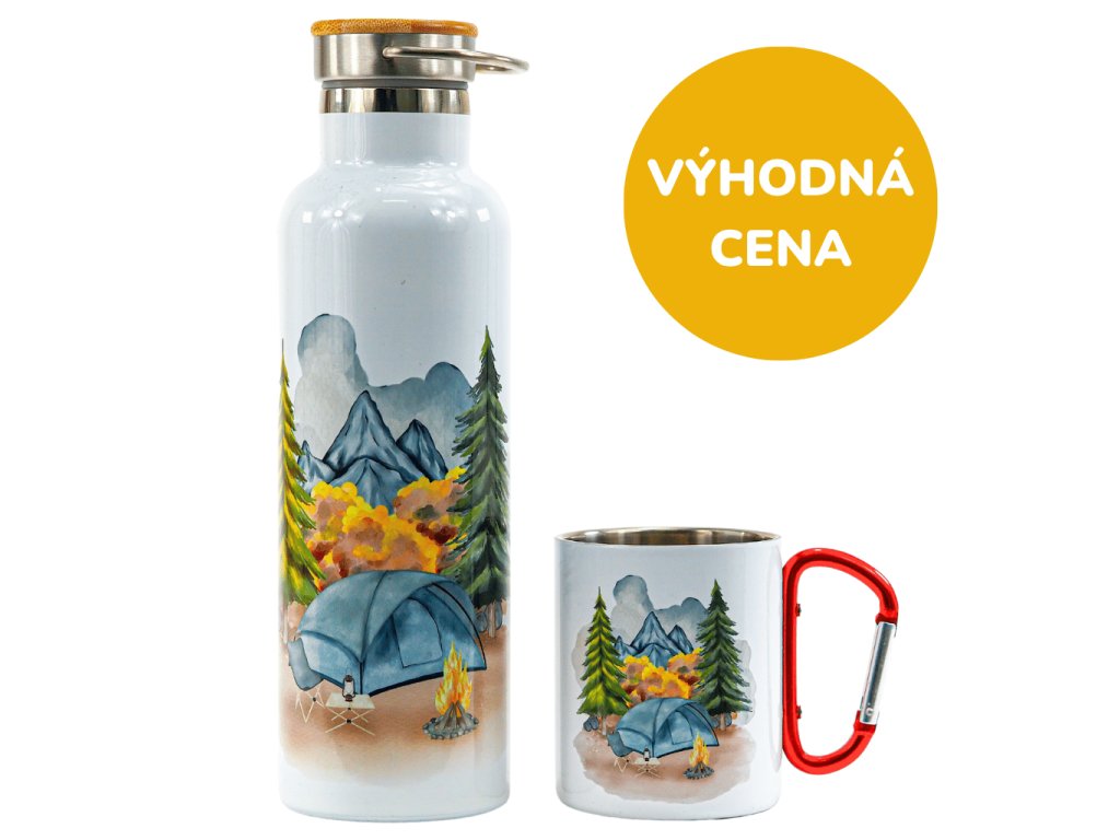 750 ml termoska a termo plecháček s karabinou s designem hor a stanu.