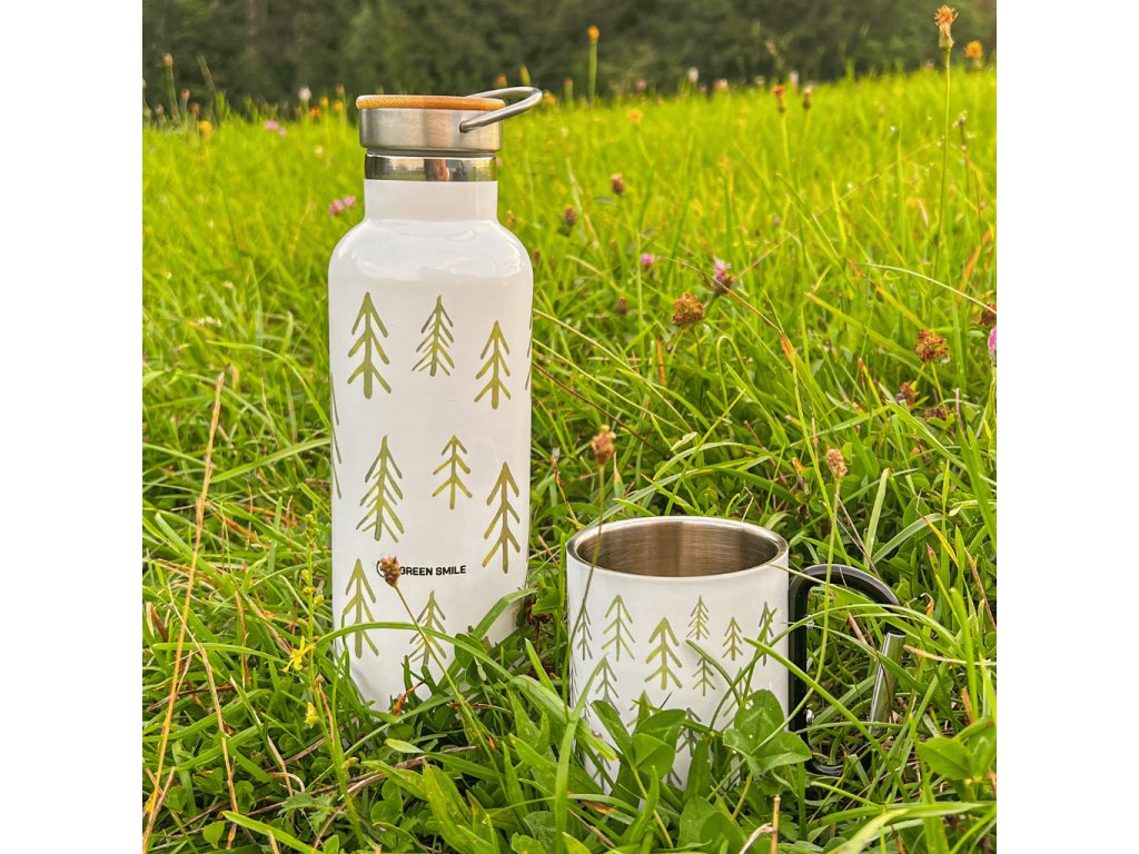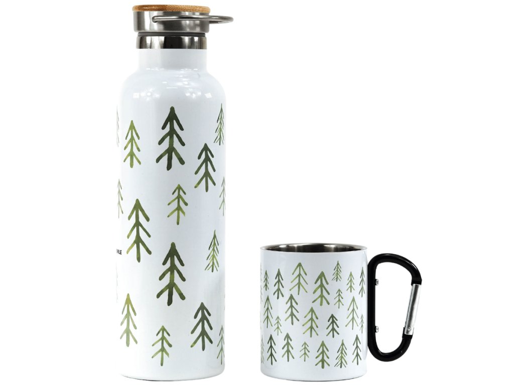 Termoska je zdobená stylovým bambusovým víčkem a termo hrnek praktickou karabinou, díky které si jej můžete zavěsit například na batoh, čímž vám zbude více místa na jiné důležité věci, které si s sebou potřebujete sbalit.