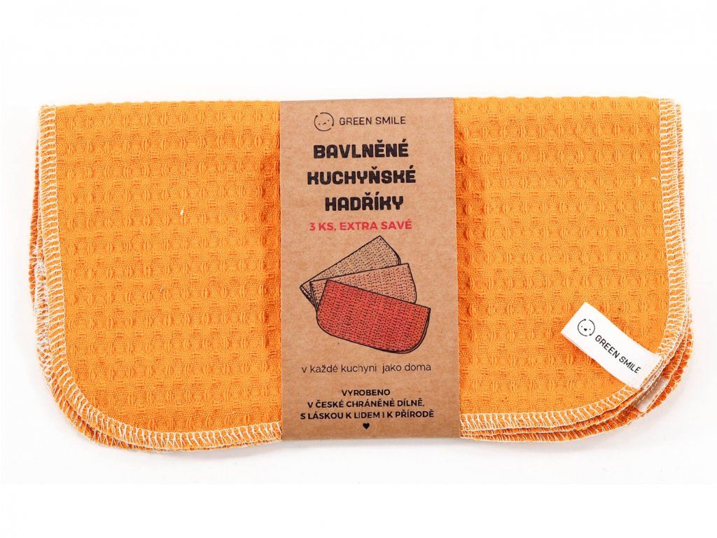 Součástí setu jsou také 3 ks žlutých hadříků (23 × 23 cm) ze 100% bavlny s vaflovou strukturou. Jsou vysoce savé, pratelné a ideální na úklid kuchyně, mytí nádobí i čištění povrchů. Doporučujeme praní na 40–60 °C.